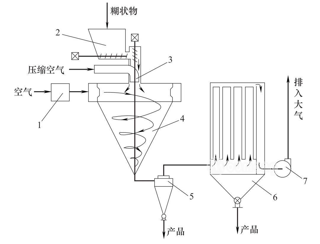 1—空氣加熱器;2—貯罐;3—二流體霧化器;4—噴霧干燥塔;5—旋風(fēng)分離器;6—布袋過濾器;7—引風(fēng)機(jī)